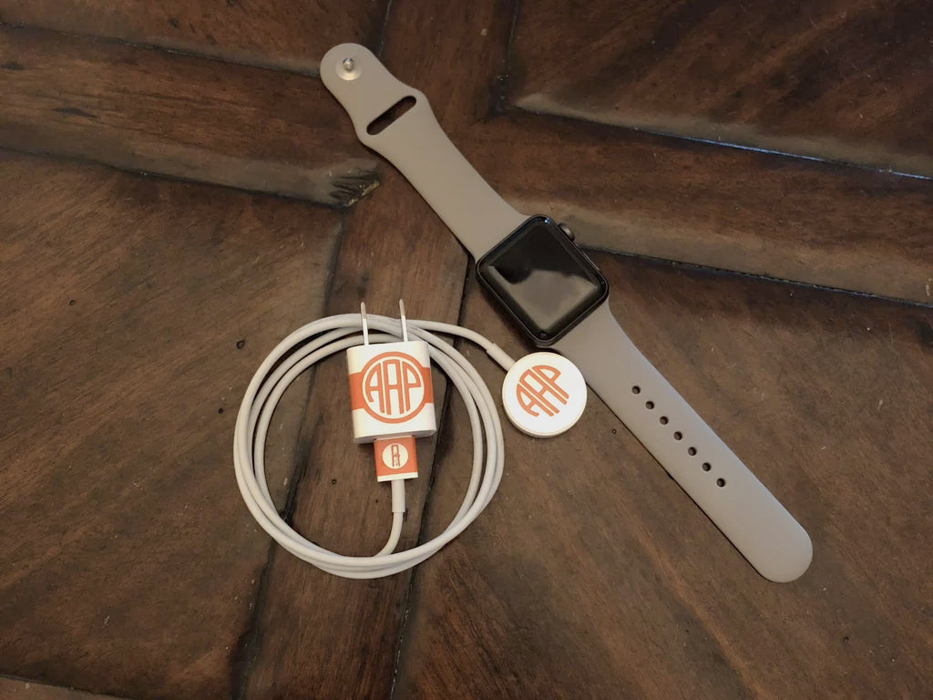 Includes the monogram for the Apple Watch block charger and docking pad. Plus, matching band for the cord.